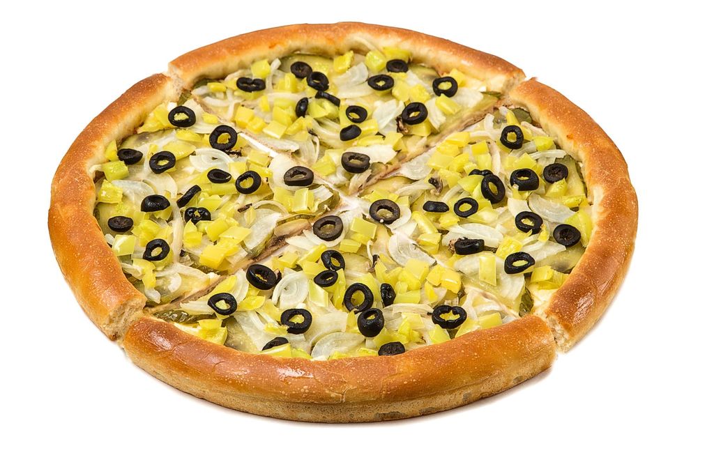 Состав: помидоры, паприка, маслины, соленый огурец, шампиньоны, лук, зелень, пицца-соус, орегано, Моцарелла.